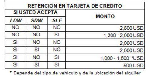 COBERTURA: OPCIONES DE COBERTURA DE SEGUROS: Thrifty recomienda encarecidamente que los clientes estadounidenses compren un seguro para ayudar a protegerlos contra la responsabilidad personal en México por daños al vehículo rentado o a terceros y sus bienes. Los clientes que no adquieran coberturas de seguros de Thrifty, y que no hayan contratado otra cobertura de seguro válida en México, pueden ser personalmente responsables ante Thrifty y/o terceros por daños y perjuicios hasta por el valor total del vehículo de alquiler y/o por todos los daños causados a terceros y sus bienes. La validez del seguro para siniestros ocurridos en México se rige por la legislación mexicana. A los clientes que estén considerando adquirir un seguro de Thrifty, se les dirige con el asesor de viajeros estadounidenses que viajan a México que se encuentra en el sitio web del Departamento de Estado de Estados Unidos, el cual establece en parte, lo siguiente: “El seguro de responsabilidad civil de Estados Unidos no es válido en México, ni tampoco lo son las coberturas de colisión o amplias expedidas por empresas estadounidenses.”http://travel.state.gov/content/passports/english/country/mexico.html (el subrayado es nuestro). • Para su comodidad, Thrifty ofrece en el mostrador de alquiler, varios productos de seguro para que los adquiera, los cuales pueden ayudarlo a reducir o eliminar su responsabilidad por daños al vehículo de alquiler o por lesiones o daños causados a terceros mientras conduce el vehículo alquilado en México. Aunque cada una de estas coberturas es opcional, Thrifty recomienda adquirir las coberturas adecuadas para su protección. • Cobertura de robo y colisión: Thrifty ofrece dos tipos de seguros para protegerse contra los daños causados por colisión y robo. • Exención de responsabilidad por daños al vehículo por pérdida ("LDW'): La cobertura LDW cubre ciertos daños y pérdidas del vehículo Thrifty causados por colisión y robo, a excepción de un deducible a cargo del arrendatario. (La cobertura LDW excluye los daños causados por vandalismo; cualquier daño a los neumáticos, cristales o llantas; y excluye otras contingencias). El deducible LDW es de USD $ 1.500 para vehículos económicos a grandes, y de USD $2,500 para Minivans y SUV. Si se declina la cobertura LDW, el cliente será responsable ante Thrifty por daños que pueden ascender hasta el valor total del vehículo de alquiler. El precio para la cobertura LDW varía de USD $20 a USD $22 diarios, dependiendo de la categoría en que se encuentre el vehículo y del lugar donde se alquile. • Exención superior de responsabilidad por daños (SDW): La cobertura SDW cubre todos los daños y pérdidas del vehículo Thrifty causados por colisión o robo, sin deducible. También cubre incidentes ocasionados a las llantas, cristales, molduras, y otros gastos imprevistos que no están cubiertos por la cobertura LDW. (La cobertura SDW excluye los daños causados por vandalismo). El precio para la cobertura SDW varía de US $15 a US $17 diarios, dependiendo de la categoría en que se encuentre el vehículo y del lugar donde se alquile. La cobertura SDW sólo se puede adquirir junto con la cobertura LDW y la de Responsabilidad civil suplementaria excedente (SLE). • Cobertura de responsabilidad personal: El Seguro suplementario de responsabilidad civil básico (PLI) está incluido en el precio de alquiler base y cubre la responsabilidad civil del conductor por lesiones corporales a terceros y por daños a la propiedad (a excepción de los daños al vehículo de alquiler) por un monto máximo de hasta MXN 750,000 pesos. Se le informa, sin embargo, que esta cobertura básica puede no cubrir completamente su posible responsabilidad por lesiones personales o a la propiedad según las leyes en los distintos estados de México en el que pueda ocurrir la lesión o daño. Para las demandas por lesiones personales, un conductor en muchos estados de México puede ser responsable por un monto de entre MXN 2,000,000 y MXN 4,000,000 pesos por persona, por evento. • Si usted desea una protección de seguro de responsabilidad adicional para protegerse mejor contra el riesgo de responsabilidad en un Estado en particular, Thrifty le ofrece la siguiente protección: • Responsabilidad civil suplementaria excedente (SLE): La cobertura SLE incrementa la cobertura PLI a MXN 4,000,000 pesos. El precio de la cobertura SLE es de US $16.99 por día. • Seguro Personal por Accidente (PAI): El seguro PAI reembolsa los gastos médicos para el conductor y los pasajeros del coche de alquiler hasta por un monto de MXN 200,000 pesos. El costo del seguro PAI es de $4.99 por día. • Requisitos de depósito de la tarjeta de crédito: Dependiendo del tipo de seguro contratado, Thrifty requiere que se retengan las siguientes cantidades de autorización de tarjeta de crédito además del costo estimado del alquiler. Los importes sujetos a estas retenciones de autorización no estarán disponibles para usarse mientras la retención tenga lugar: